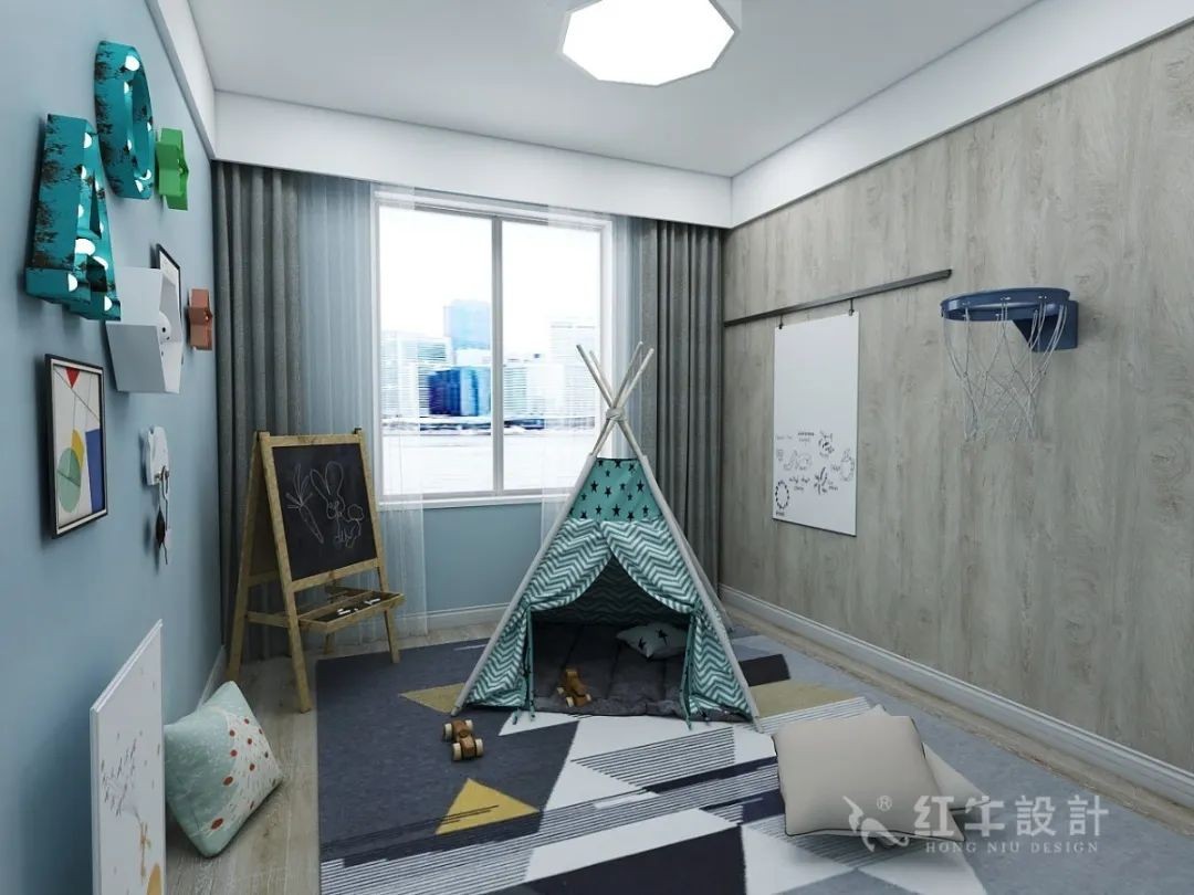 兒童玩具房內(nèi),有帳篷,小黑板,籃框,是孩子快樂的小天地。