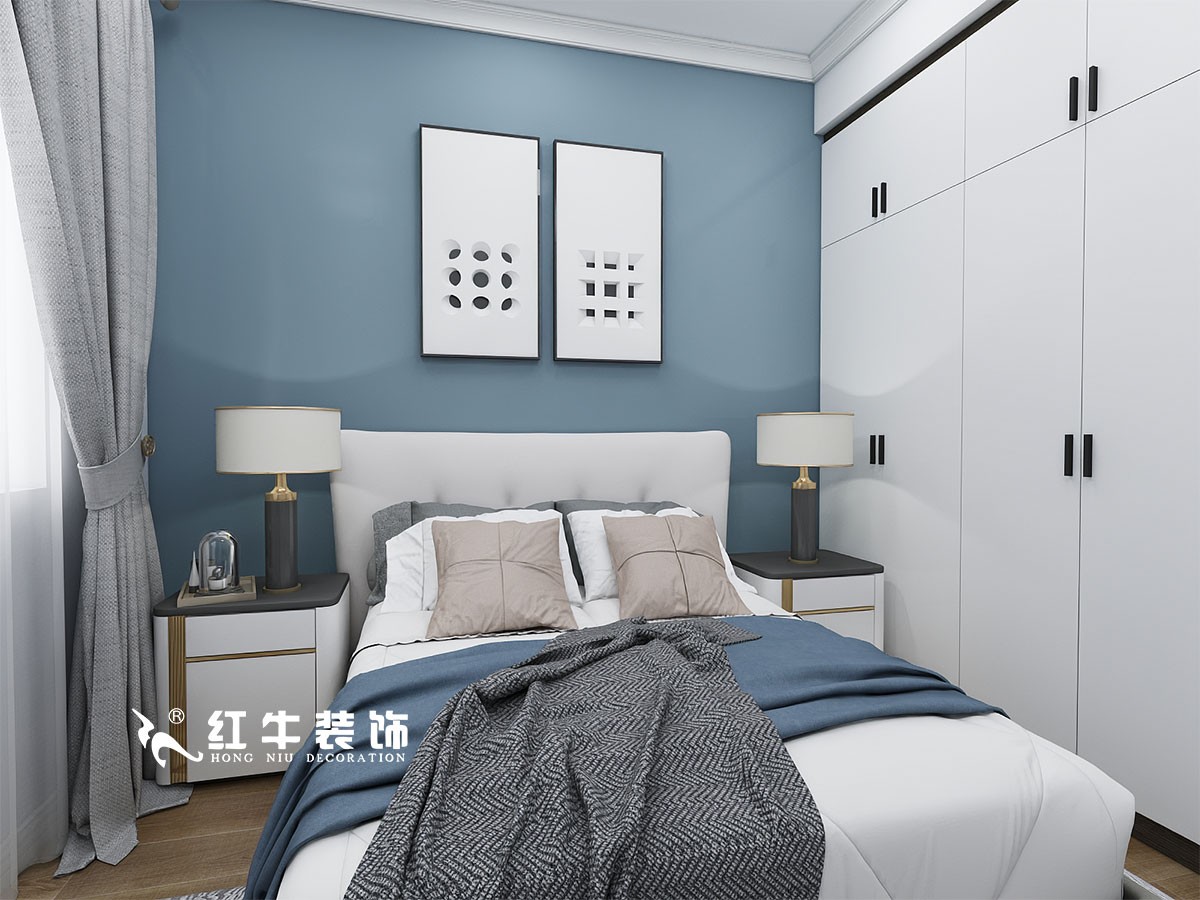 次臥背景墻是藍(lán)色的,床品也與此進(jìn)行呼應(yīng),再加上對(duì)稱的床頭柜設(shè)計(jì),整個(gè)空間看上去靜謐又嚴(yán)謹(jǐn)。