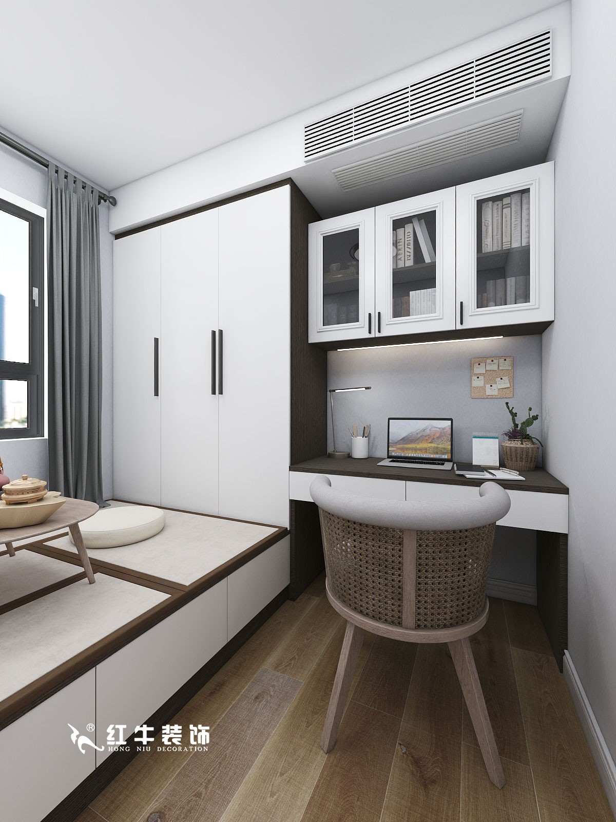 不大的房間里既有榻榻米和衣柜,還專門定制了書桌與書柜,空間利用率非常之高。吊柜下方暗藏?zé)艄?,?chuàng)造良好的照明環(huán)境。