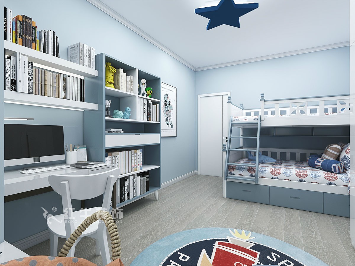 小男生的居住空間需開放活波,上下床搭配全屋定制衣柜和書桌,后期都可根據(jù)自己的喜好來改善和配置,在此空間內(nèi)采用了調(diào)色的處理,淡藍(lán)色的背景較安逸。