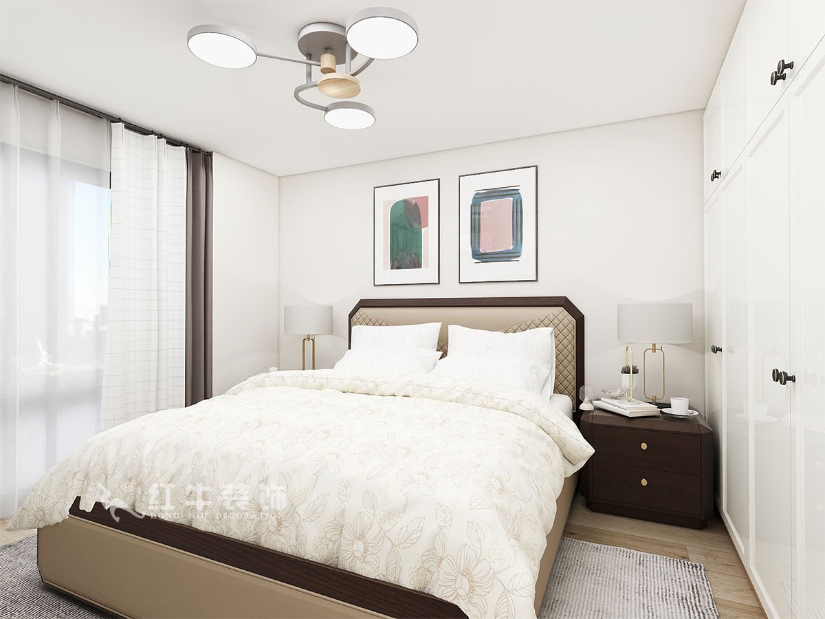 主臥布置方面遵循了對(duì)稱的原則,體現(xiàn)了一種平衡性。白墻、白門、白衣柜,白色床品,整體以白色為主,營(yíng)造了一種雅致舒適的效果,有利于業(yè)主在睡前保持一種輕松安靜的狀態(tài)。