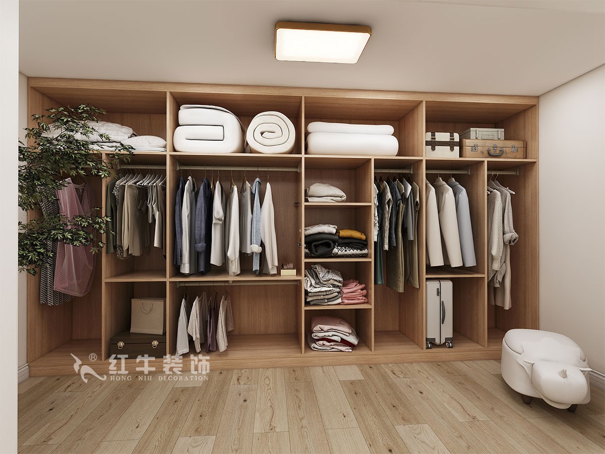 次臥內(nèi)部是一字型衣帽間,根據(jù)業(yè)主的個(gè)人習(xí)慣和衣服情況劃分存儲(chǔ)空間,分出不同尺寸的疊放區(qū)和懸掛區(qū),使得收納效果更加合理,利用率更好。