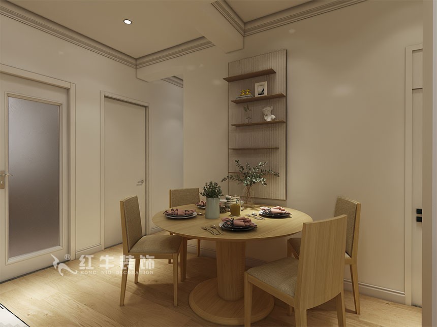 圓桌更加親密浪漫,用餐人可以同時(shí)看見其余所有的人,交流更加方便。墻面上裝飾的隔板架,增加了整體區(qū)域的設(shè)計(jì)感。