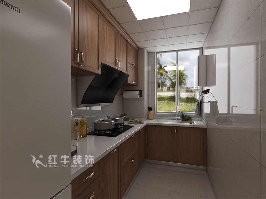 長(zhǎng)方形的廚房設(shè)計(jì)成L型,底部的櫥柜加上方的吊柜,滿足收納需求。窗戶下方做水槽,水槽和灶臺(tái)的中間作為操作臺(tái),洗切炒的動(dòng)線非常流暢。
