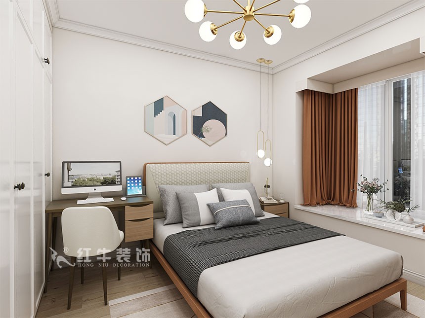整體風(fēng)格簡約,白色和木紋色營造出溫馨的生活氣息,次臥室設(shè)計了組合柜,既有學(xué)習(xí)的區(qū)域同時也兼顧了休閑空間。