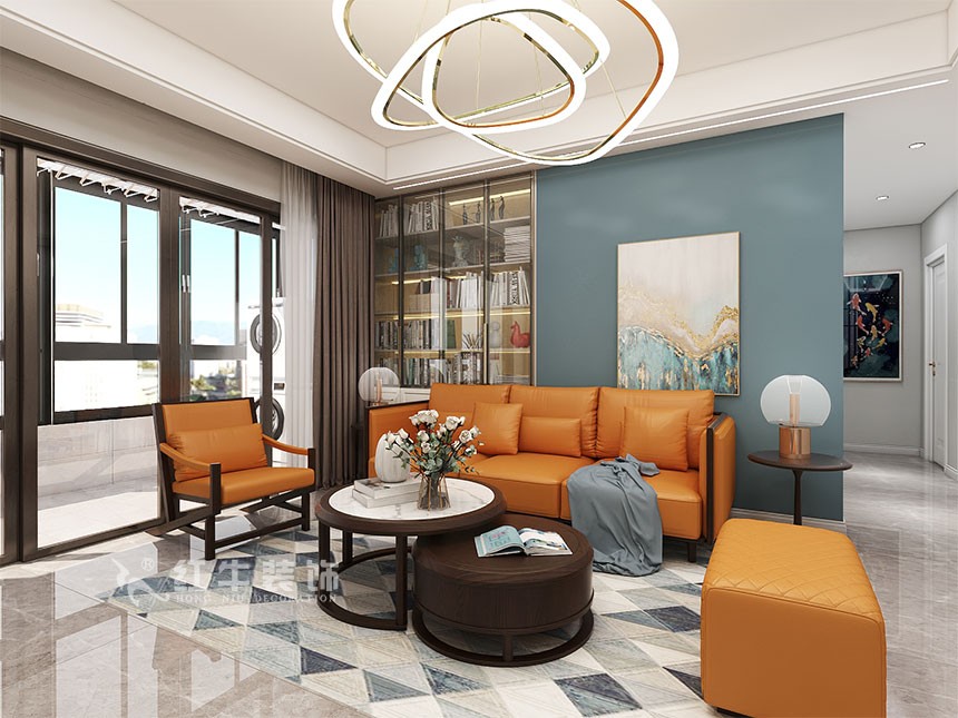 背景墻部分一分為二,一半是亮眼的背景色彩搭配大幅的裝飾畫,非常吸睛,另一半是書柜墻,還特別安裝了玻璃門,使其變得更有藝術(shù)感。