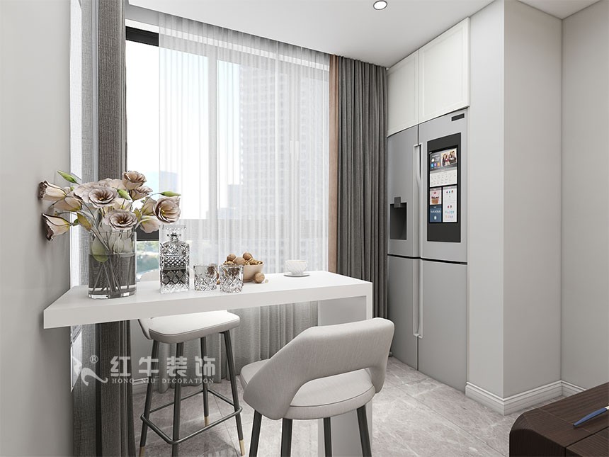 客廳北陽(yáng)臺(tái)打通并入餐廳,冰箱外置,增加廚房?jī)?nèi)部電器空間,增加了餐廳水吧臺(tái),層次更分明,提升了整體效果。
