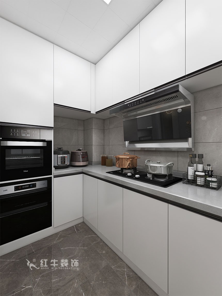 白色櫥柜特別適合這樣的小廚房,能增加廚房亮度,還能展現(xiàn)出一種清潔感。吊柜、地柜一應(yīng)俱全,提供了極大的收納空間。