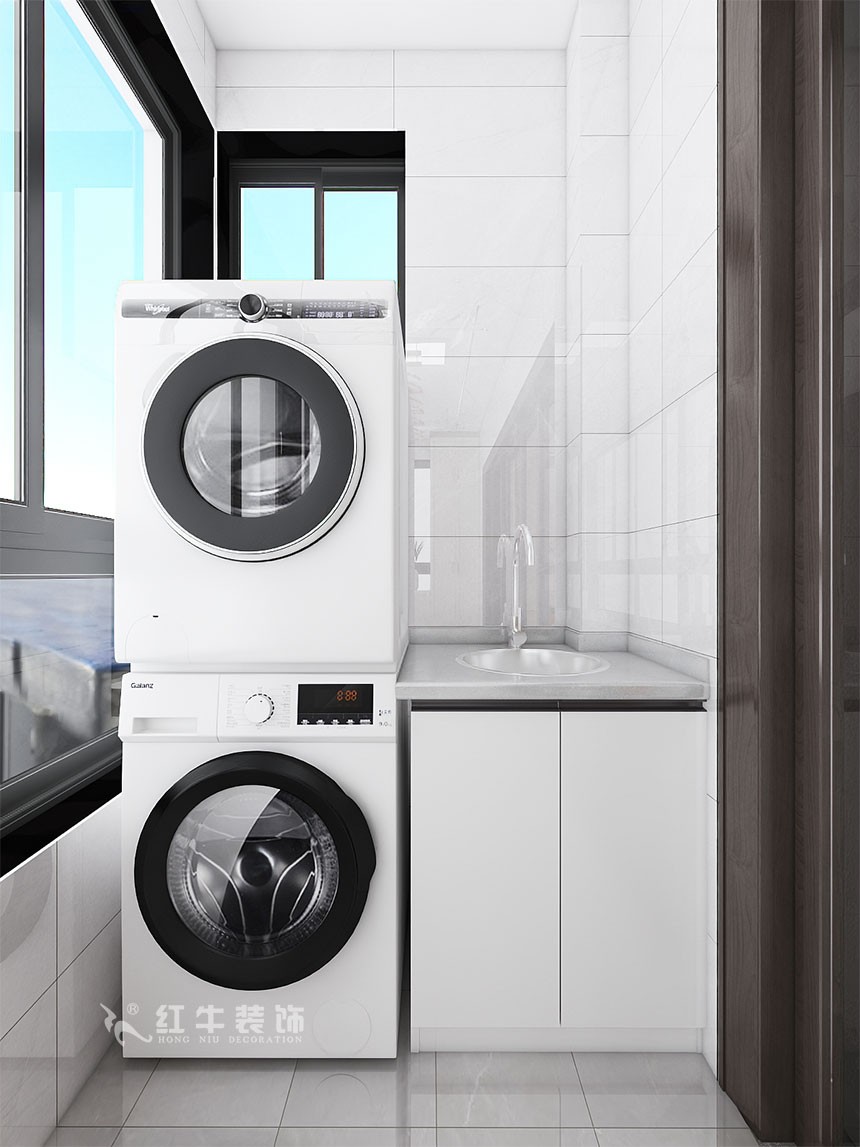 陽(yáng)臺(tái)不只是作為晾曬區(qū),更是作為洗衣房存在,設(shè)計(jì)了洗衣機(jī)、洗手臺(tái),空間利用率很高。