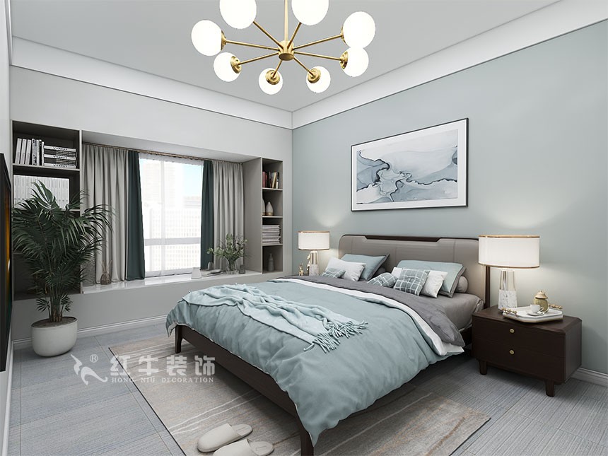 藍(lán)色中加入一點(diǎn)灰調(diào),增加一些質(zhì)感,搭配木質(zhì)家具以及黃銅元素的燈具,融合進(jìn)輕奢元素,打造清新愜意的臥室氛圍。