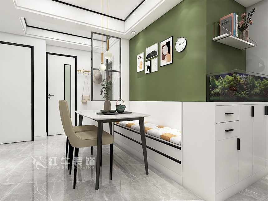 本案設(shè)計(jì)顏色對(duì)比鮮艷,結(jié)構(gòu)比較好,沒有太大改動(dòng)。餐廳選用卡座配以活動(dòng)餐椅相結(jié)合,有效利用空間,增加儲(chǔ)物的位置。延伸柜體滿足客戶喜歡養(yǎng)魚的習(xí)慣,墻面適當(dāng)幾處調(diào)色漆的點(diǎn)綴,讓空間瞬間變得特別??蛷d無(wú)主燈的選用,光源變得柔和,靈動(dòng),一看就知道是年輕人的居所。