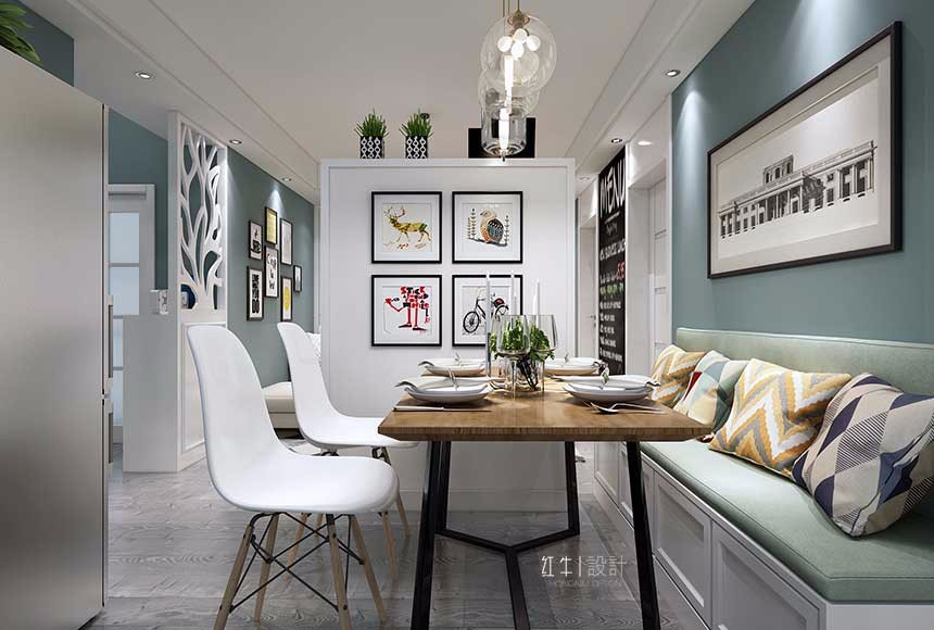 本案住宅是一個重點學(xué)區(qū)房,業(yè)主居住時間會比較長,所以在空間的利用和收納這一塊要比較多的空間,在門廳的設(shè)計采用了雙收納鞋柜加玄關(guān)的一個處理方式,門廳獨立,收納空間比較的情況下,還不影響視線。餐廳和客廳之間制作了一個1米6的高的電視背景墻,在背景墻后面制作了一個卡座形式的餐廳,空間得到了最大化的利用,在沙發(fā)后面做了一整面的裝飾櫥柜,不僅起到裝飾效果還增加了空間利用。整體色調(diào)以灰色,豆沙綠,木色做為基礎(chǔ)色調(diào),然后穿插使用鮮艷的顏色或者黑色的裝飾物體作為擺件。讓空間活潑生動。