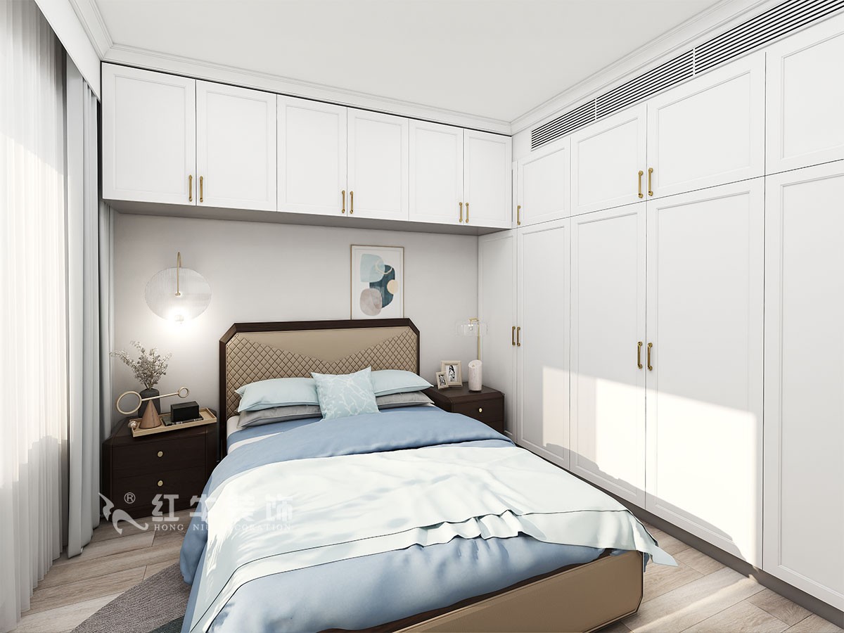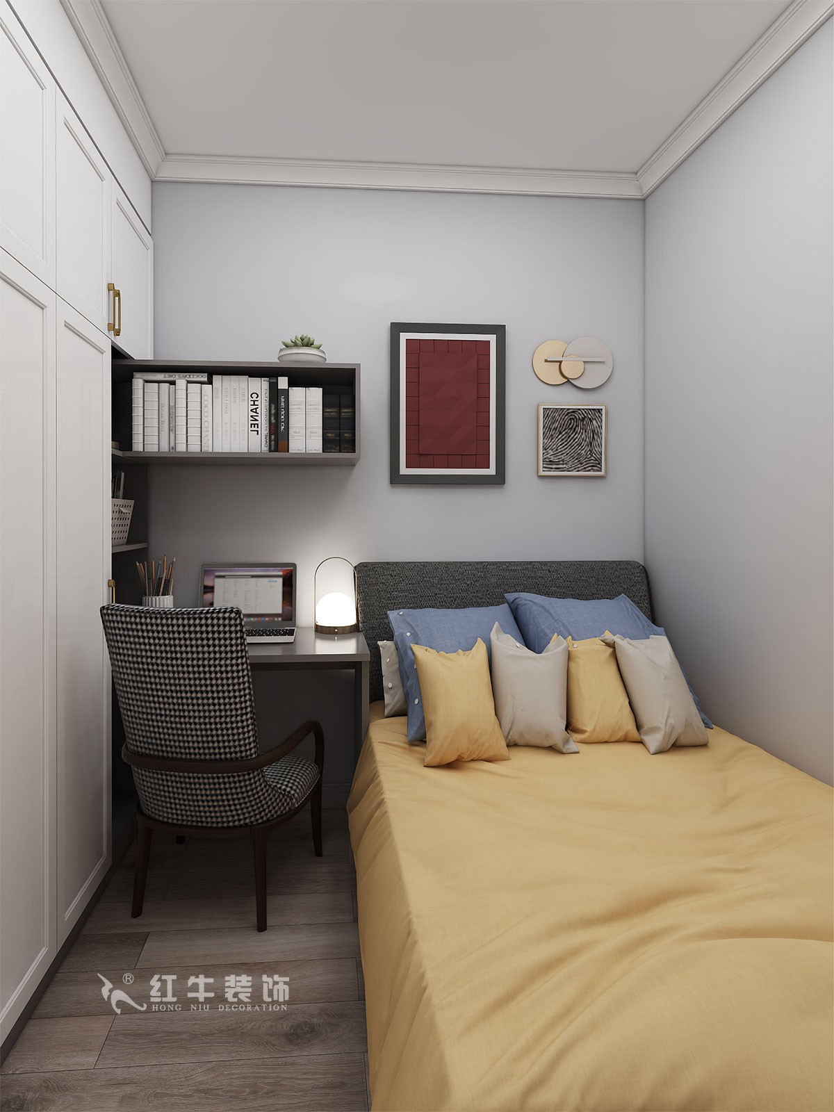 整體風(fēng)格簡約,白色和木紋色營造出溫馨的生活氣息,次臥室設(shè)計(jì)了組合柜,既有學(xué)習(xí)的區(qū)域同時(shí)也兼顧了休閑空間。