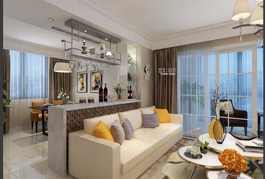 此案設(shè)計運用了石材、不銹鋼、硬包、馬賽克等材質(zhì),通過不同材質(zhì)帶來的質(zhì)感體現(xiàn)人們對生活的態(tài)度及品質(zhì)的追求。布藝沙發(fā)、金屬包邊的茶幾、背景墻局部橙色的跳色,顯得整個俏皮但又不缺乏生活氣息的居所。