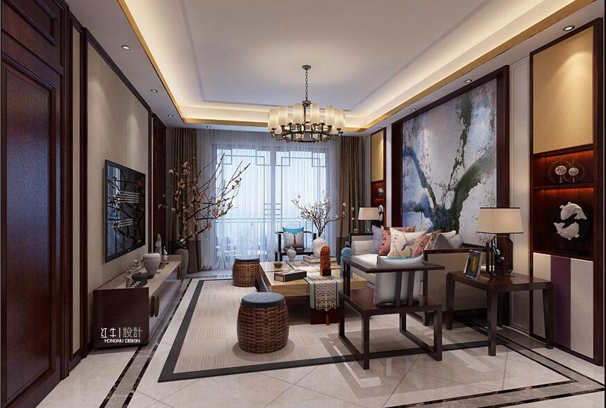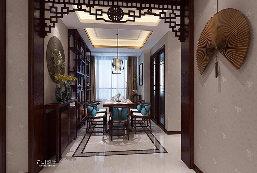 本案設(shè)計使用了中式的屏風或窗欞、中式木門、簡化的中式博古架等。通過這種新的分隔方式展示出中式家具的層次之美。再配一些簡約的造型為基礎(chǔ),添加了中式元素,使整個空間更加豐富,