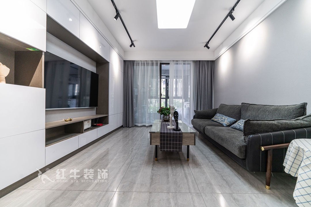 整個空間采用冷灰色調(diào),簡潔干練,電視背景墻做成整體電視柜的形式,增加收納空間,板材的黑跟門板的烤漆白顯得空間明朗化,沙發(fā)背景貼冷色灰色墻布,頂部配以軌道燈修飾,使得不大的空間格局增大的視覺感。
