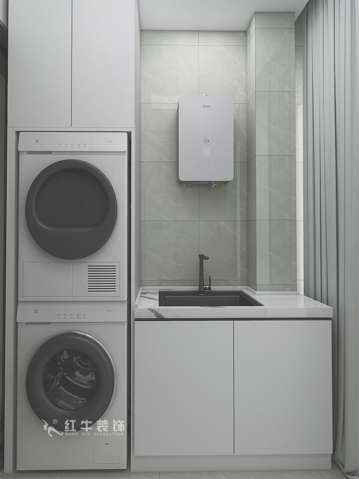 房子比較規(guī)整,就是空間最大化利用,北陽(yáng)臺(tái)規(guī)劃成一個(gè)生活陽(yáng)臺(tái),兩個(gè)衛(wèi)生間都保留不動(dòng)。把原過(guò)道的墻打掉,設(shè)計(jì)了一組高柜,滿足電器的擺放還有餐邊柜的功能。